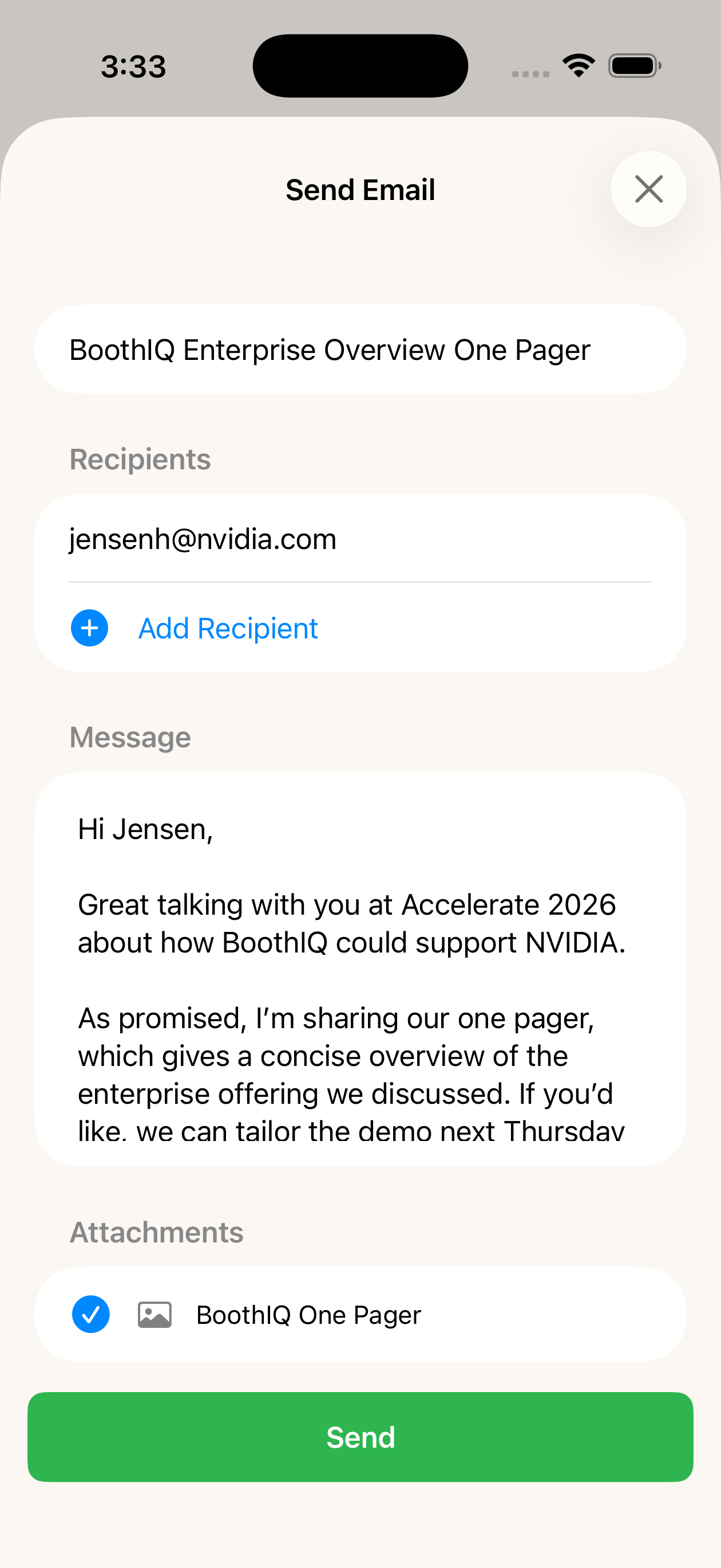 Snap a badge, record the conversation, or leave a voice note from the hotel lobby later. However your day goes, BoothIQ keeps up.